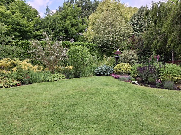 Langs het huis aan een groot gazon zijn meerdere kleurrijke borders aangelegd. Via het gazon kom je langs een kippenhok en een kleine moestuin. Achter het huis gaat het gazon over in een rozenborder en aan het eind is nog een klein bosperceel met een slingerend pad hier doorheen.